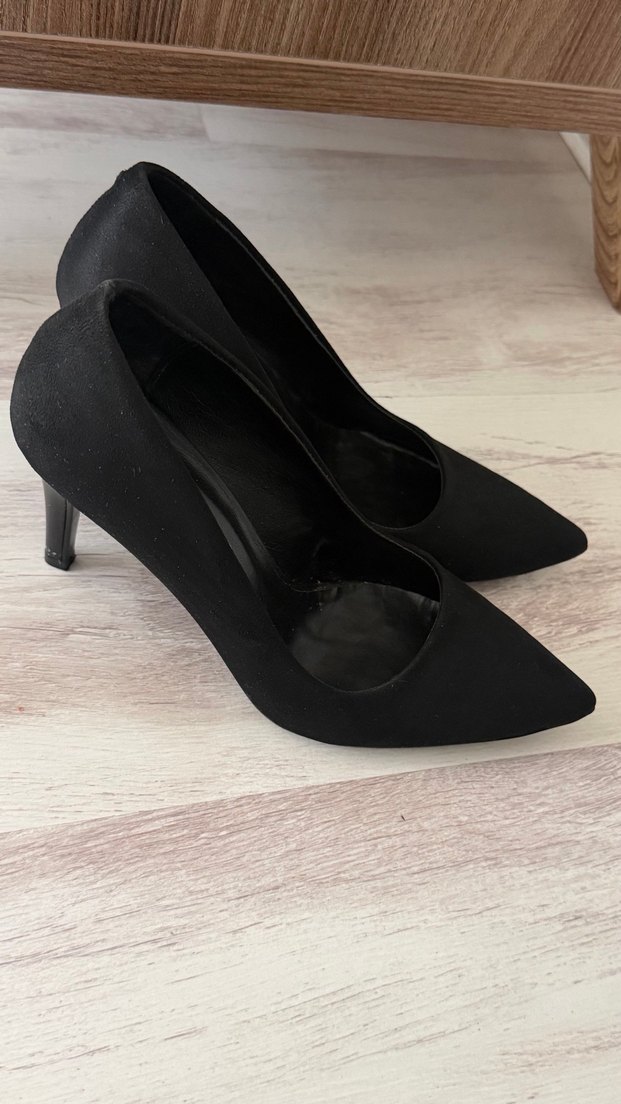 Siyah süet stiletto, sivri burunlu ve zarif silüetli, ofis kullanımı ve klasik şıklık için ideal. Minimalist tasarım, zahmetsiz şıklık sunar. Çok temiz ve yenidir en fazla 2kez özel günlerde kullanıldı sadece topuk uç kısmında hafif çizgi oluşmuş göze batmıyor topuk boyu 8cm