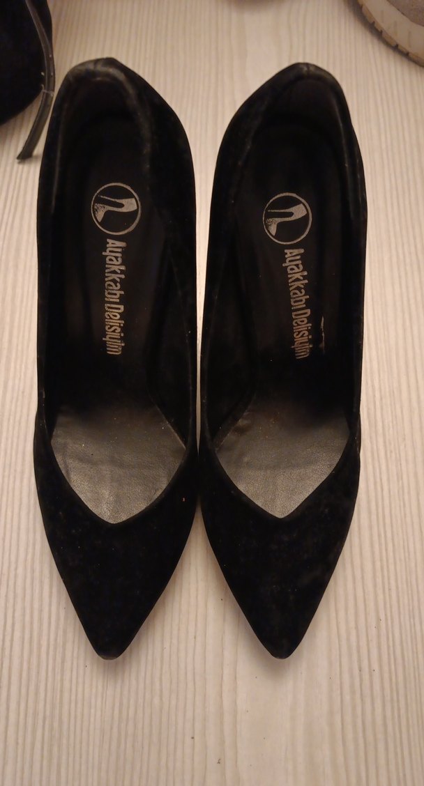 Siyah süet malzemeden yapılmış, desensiz stiletto topuklu ayakkabılar. Gotik tarzı ve şık tasarımıyla romantik akşamlar için ideal.