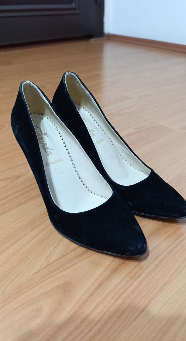 Siyah süet malzemeden yapılmış, klasik ve desensiz stilettolar. Ofis kullanımı için uygun, geleneksel tarzda ve zahmetsiz şıklık sunar.