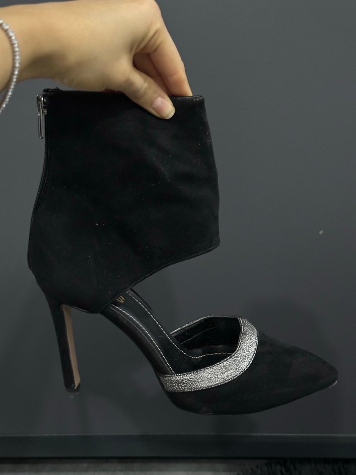 Siyah süet malzemeden yapılmış, kemer detaylı ve hafif yılan derisi desenli stiletto topuklu ayakkabı, romantik akşamlar için uygun.