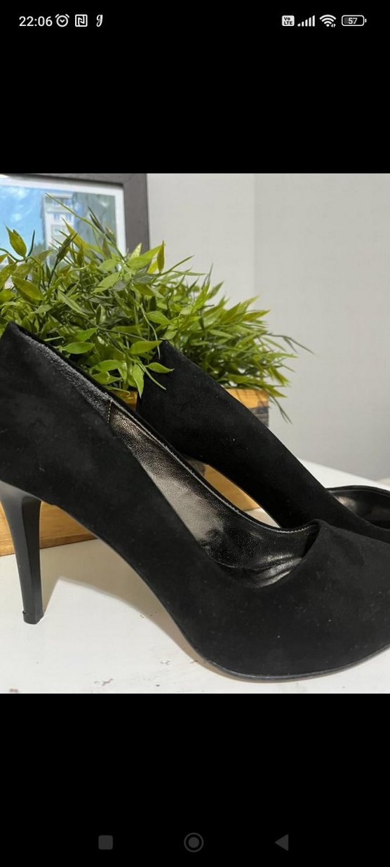 Siyah süet malzemeden, baskılı desene sahip stiletto topuklu ayakkabılar. İş ortamı için cesur ve çağdaş tasarım, zahmetsiz şıklık sunar.