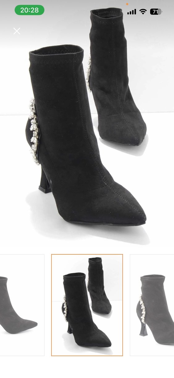 Siyah süet stiletto topuklu botlar, yılan desenli ve tokalı detaylarla. Gösterişli ve avangart tarz için uygundur. Bir kaç kez giydim yeni