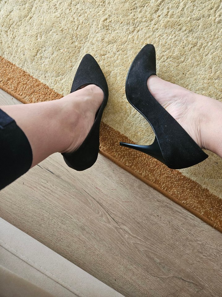 Siyah süet malzemeden yapılmış, sivri burunlu ve yırtmaç detaylı stiletto topuklu ayakkabılar. Ofis için cesur ve gotik bir tarz sunar.