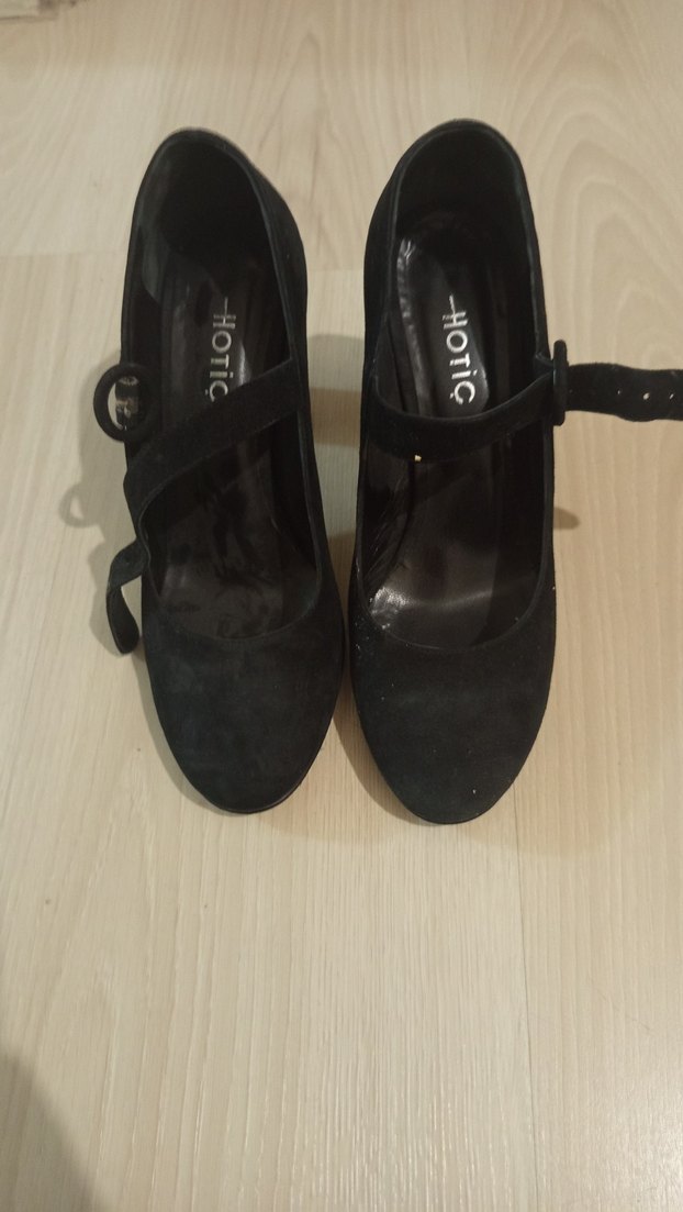Siyah süet malzemeden yapılmış, stiletto topuklu ve tokalı kayışlı platform topuklu ayakkabılar. HOTiC markalı, gotik tarzda, romantik akşamlar için uygun.