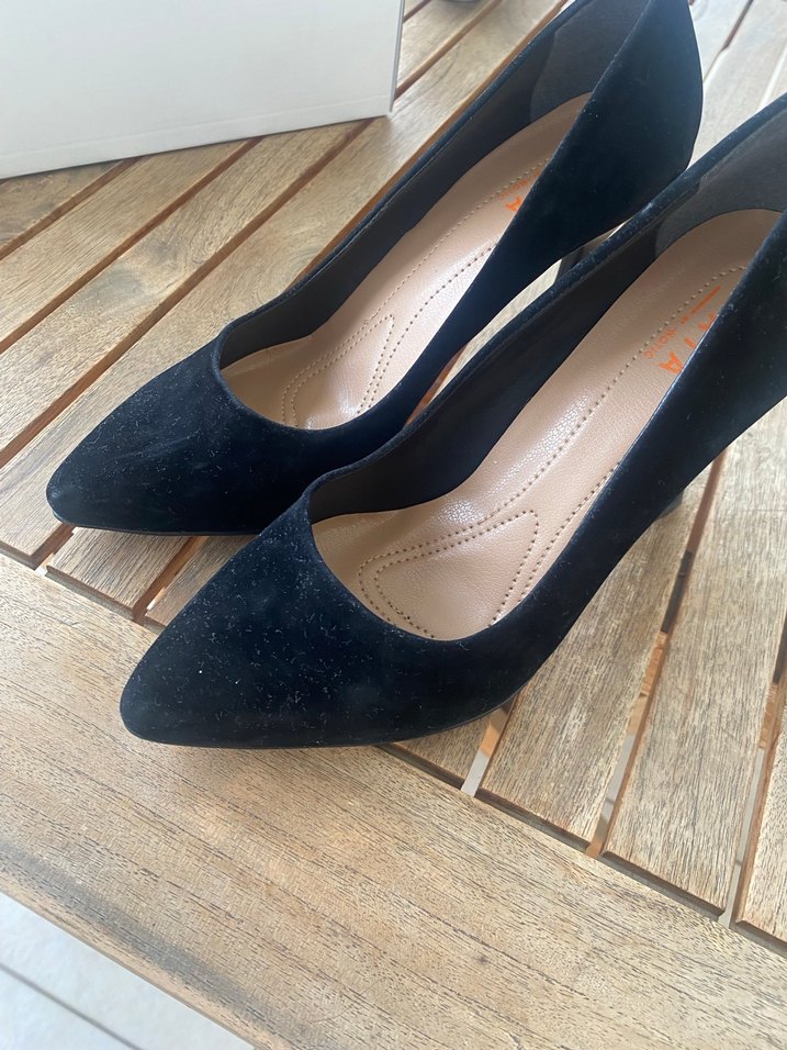 Siyah süet malzemeden yapılmış, sivri burunlu ve zarif hatlara sahip stiletto topuklu kadın ayakkabısı. Ofis kullanımı ve davetler için uygundur ve zahmetsiz şıklık sunar.