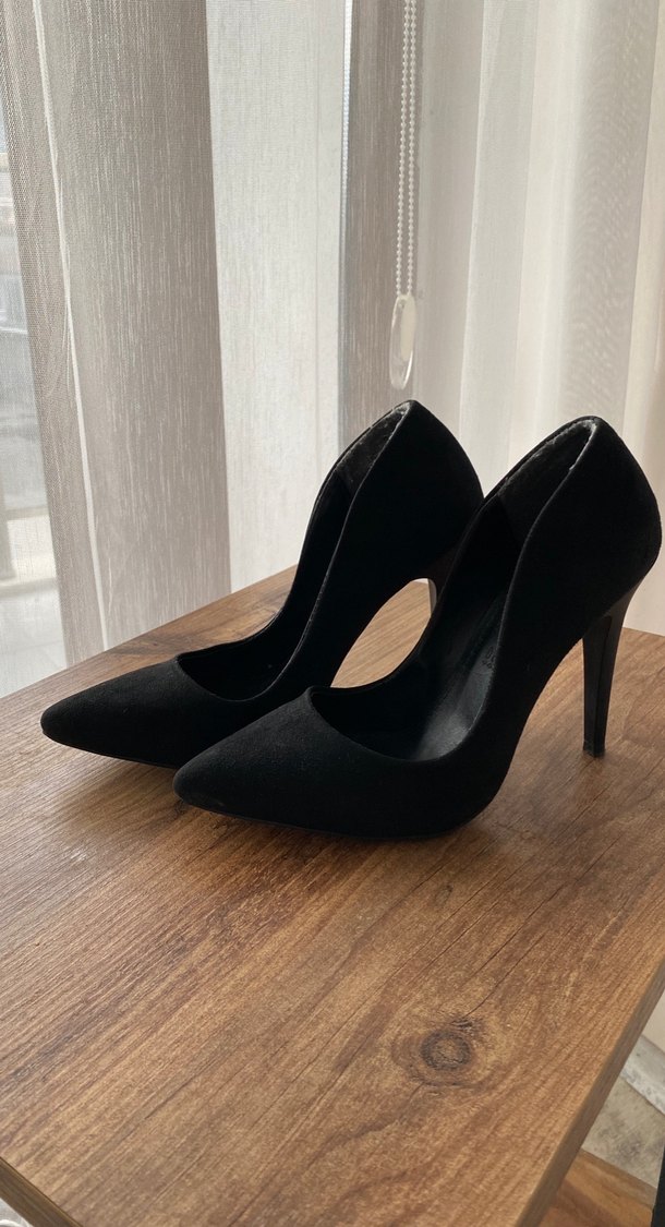 Siyah süet stiletto topuklu, sivri burunlu ve şık tasarıma sahip, ofis için uygun ve zahmetsiz şıklık sunar. Klasik ve modern zarafet bir arada.