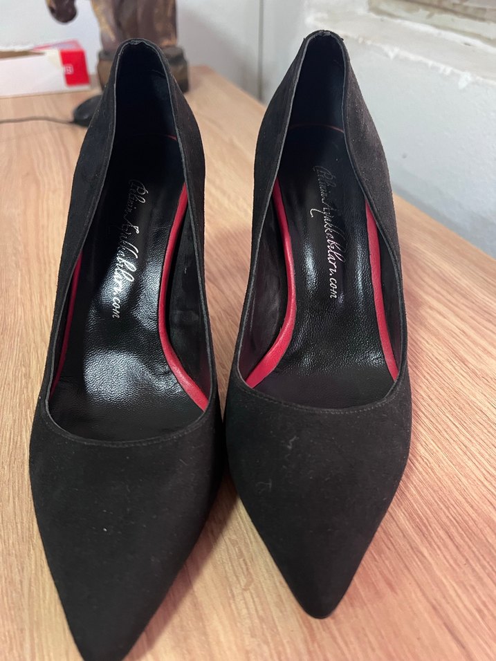 Siyah süet malzemeden yapılmış, sivri burunlu ve şık tasarımlı stiletto topuklu kadın ayakkabı, romantik akşamlar için zarif ve rahat bir seçim.