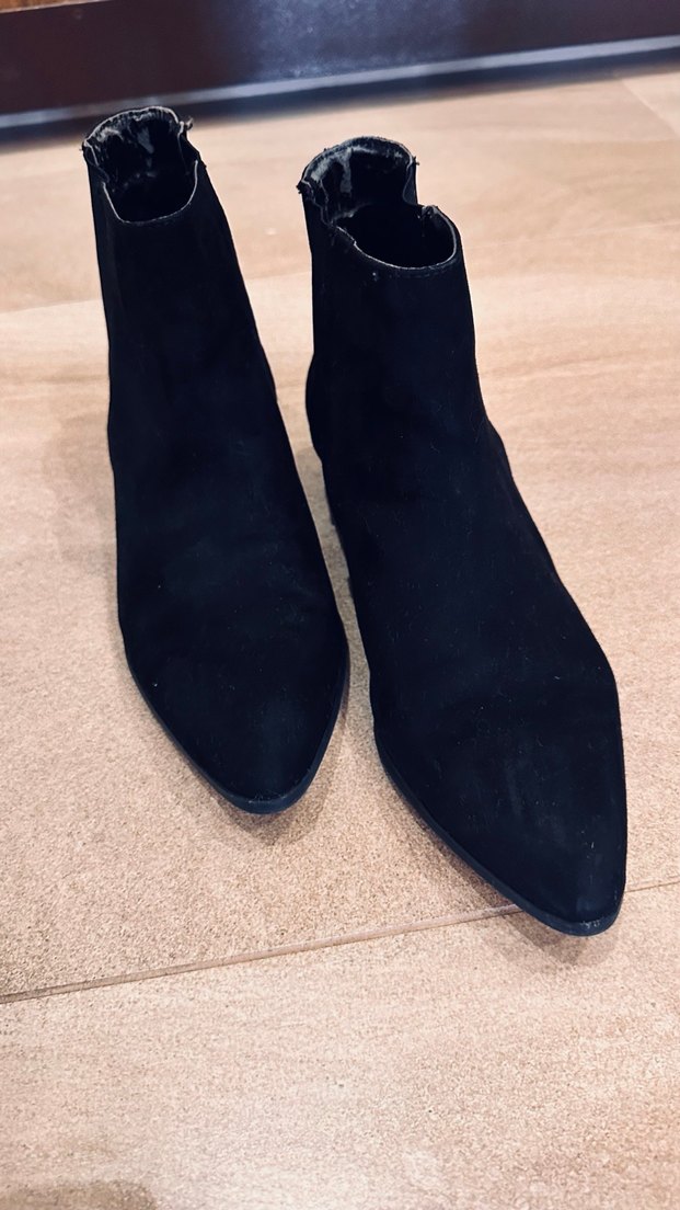 Siyah süet malzemeden yapılmış, stiletto topuklu kadın botu. Minimalist goth tarzıyla günlük şıklık sunar, desen içermez. Son fotoğrafta iç kısmında hafif soyulma görünüyor onun dışında bir kusuru yoktur. Giyilince görünmüyor. Fiyata yansıtıldı.