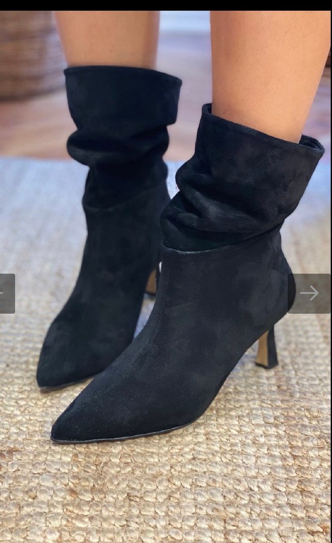 Siyah süet malzemeden, stiletto topuklu ve kemerli tasarıma sahip, romantik buluşmalar için uygun kadın botları. Pumps marka..rengi süet boyasıyla yenilenebilir çok giyilmedi ama durmaktan matlaştı