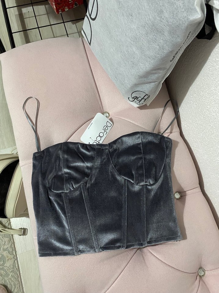 Bu siyah süet büstiyer, ince askılar ve straplez yakaya sahiptir. Kısa boylu, kemer detaylı ve sokak modasına uygundur.
