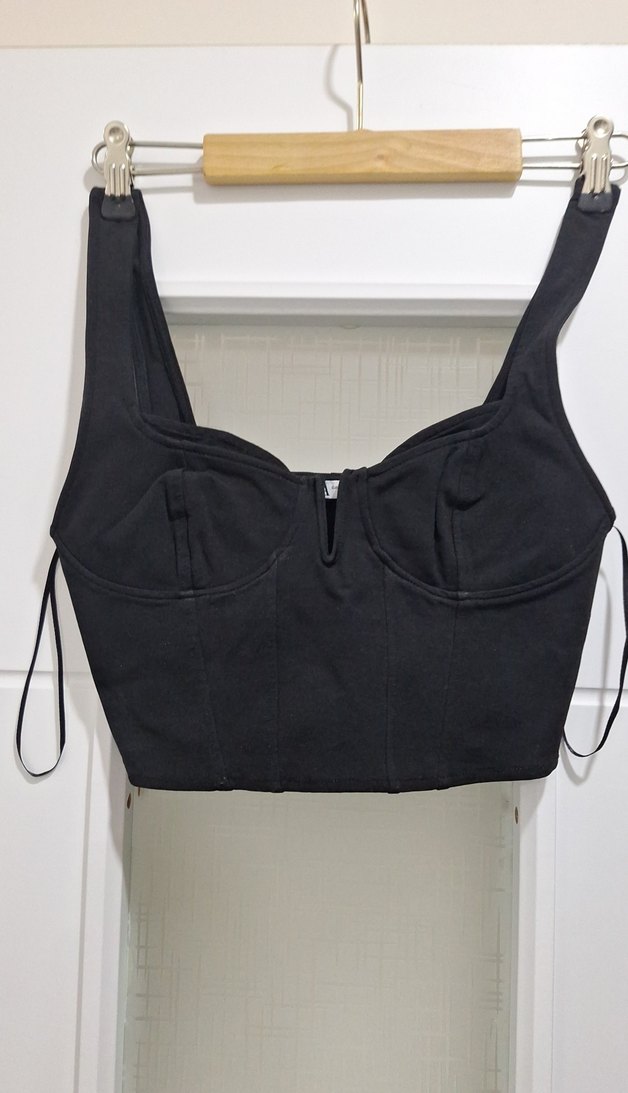 Siyah süet kumaştan, strappy askılı, straplez yakalı ve vücuda oturan tasarıma sahip cesur bir sokak stili büstiyer.