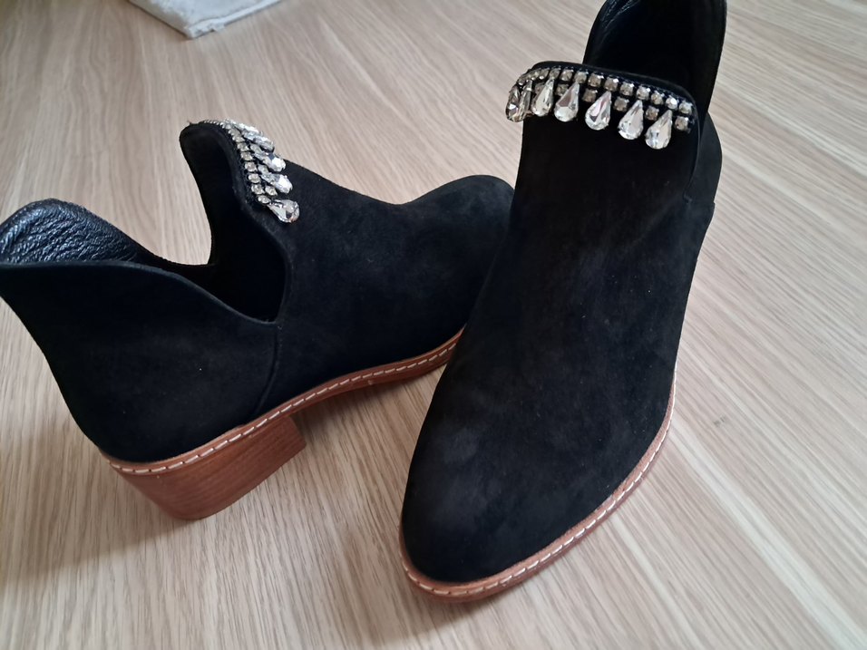 Siyah süet kadın botları, blok topuklu ve ışıltılı taş detaylı. Günlük kullanım için rahat, trendi ve rahat gotik tarzda. ✨1 kez giyildi hic bir sorunu yoktur her kombine uyar 36 numara 36.5 giyene uygundur sorunsuz yeni orjinal Roman marka hakiki nubuk deridir guvenle alisveris yapabilirsiniz hanimlar