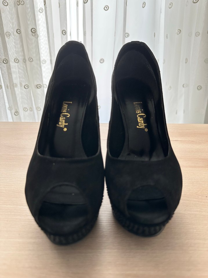 Siyah süet, platformlu, platformu ve topuğu boydan boya siyah taşlı, çok şık ve rahat abiye ayakkabı, topuk boyu 12 cm, 37 numara