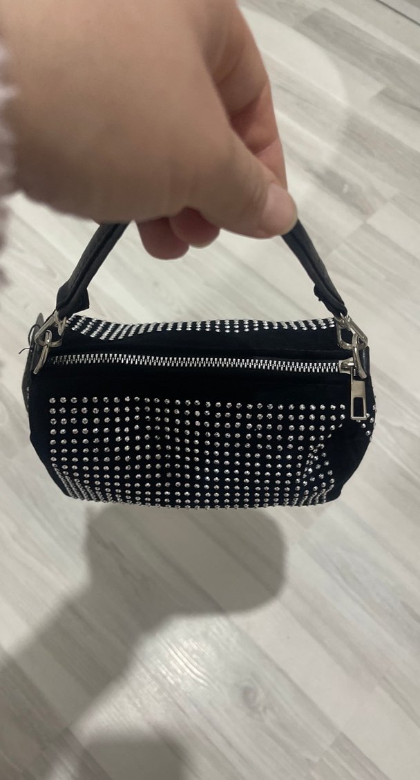 Gümüş taşlarla süslenmiş siyah süet çanta, çıkarılabilir sap ve fermuarlı kapama özelliğine sahiptir. Rock punk tarzını yansıtır.sıfırdır zinciri içinde mevcuttur