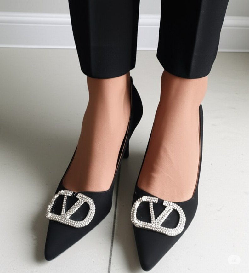 Siyah süet, taşlı tokalı, yüksek topuklu kadın gece ayakkabısı. Düğünler için uygun, klasik gotik ve gösterişli tarzda.
