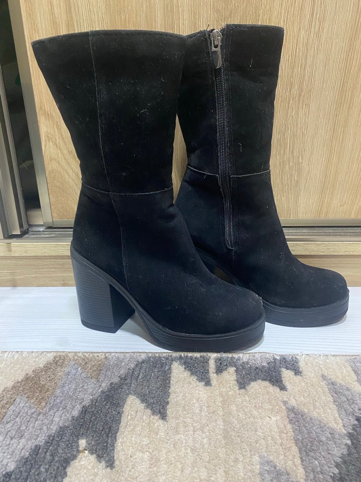 Siyah süet malzemeden blok topuklu, tokalı ve yan fermuarlı botlar. Rahat ve trend goth tarzını yansıtan günlük kullanıma uygun. Ürün hiç kullanılmamıştır