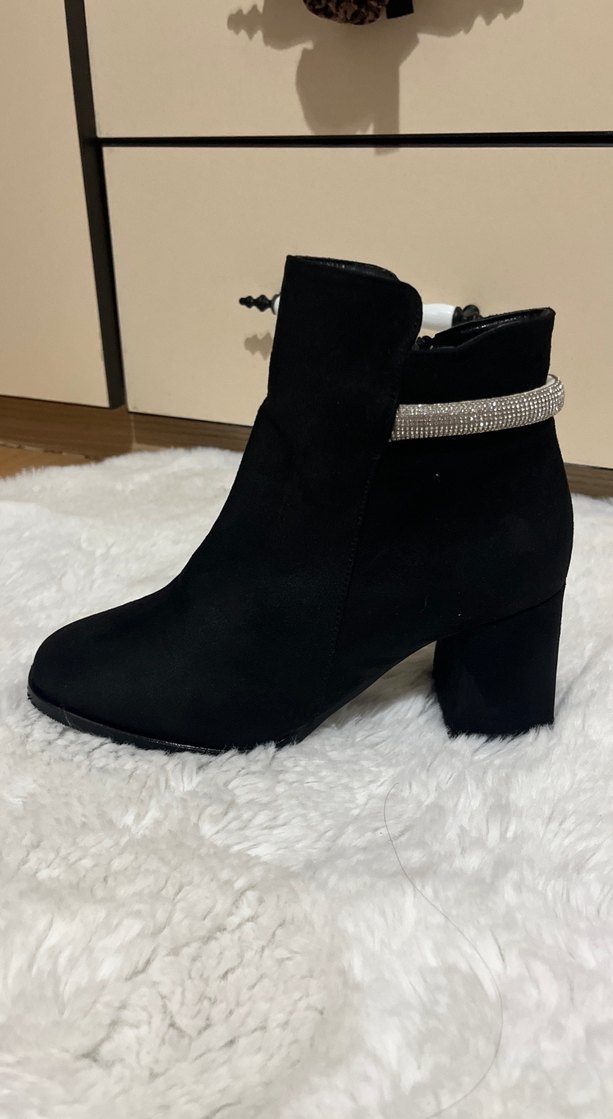 Siyah süet kadın botları, blok topuk ve parlak tokalı yılan desenli detaylarla rahat gotik ve trend günlük tarz sunar. Bir kez giyildi