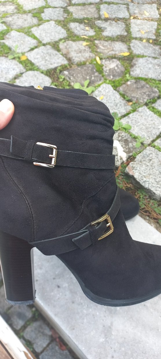 Siyah süet kadın botları, blok topuklu ve tokalı detaylara sahip. Topuk 10cm.,yurtdışınde alındı, sayılı kullanılmış
