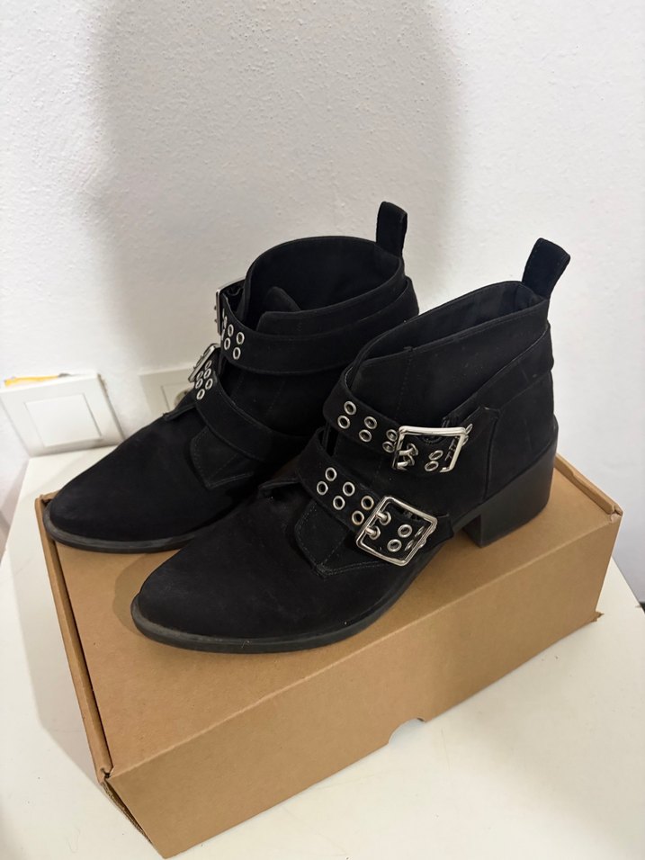 Siyah süet malzemeden yapılmış, blok topuklu ve çift tokalı goth tarzı bot. Günlük kullanım için uygun, trend ve rahat bir model.