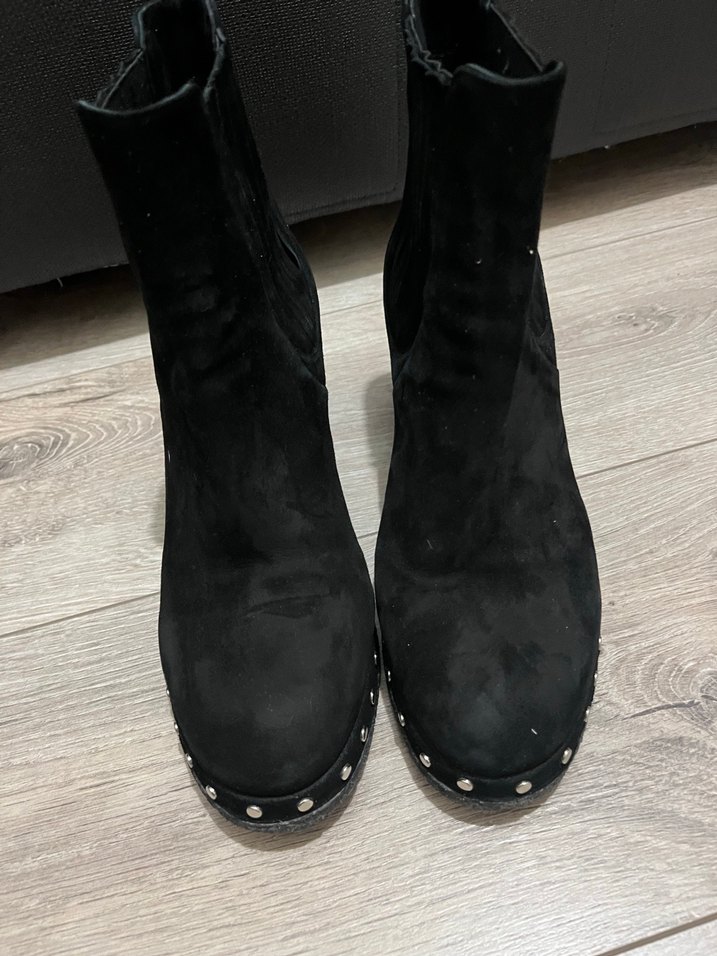 Siyah süet kadın botları, blok topuklu ve tokalı detaylara sahip. Taban kenarında metal zımbalar bulunur. Düz ve desensiz goth tarzı.