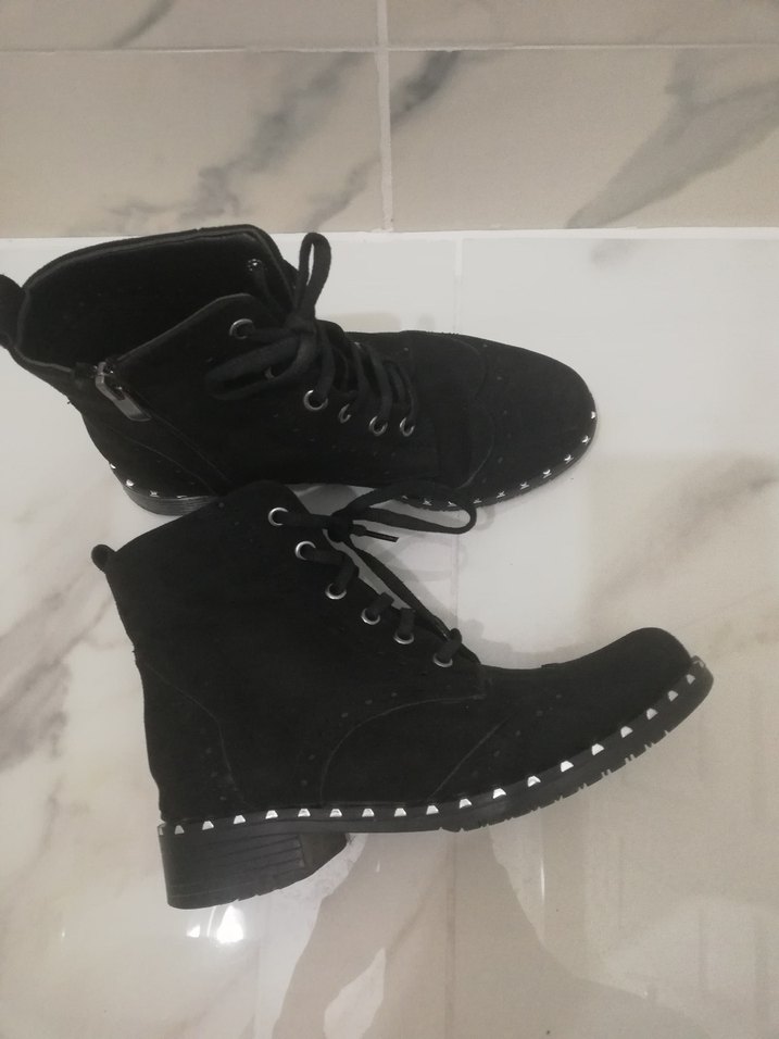 Siyah süet, blok topuklu botlar, tokalı detaylar ve taban çevresinde gümüş zımbalarla. Desensiz, gotik ve rock punk tarzlarına uygun. Bambi marka, 37 numara hiç bir sorunu yoktur.
