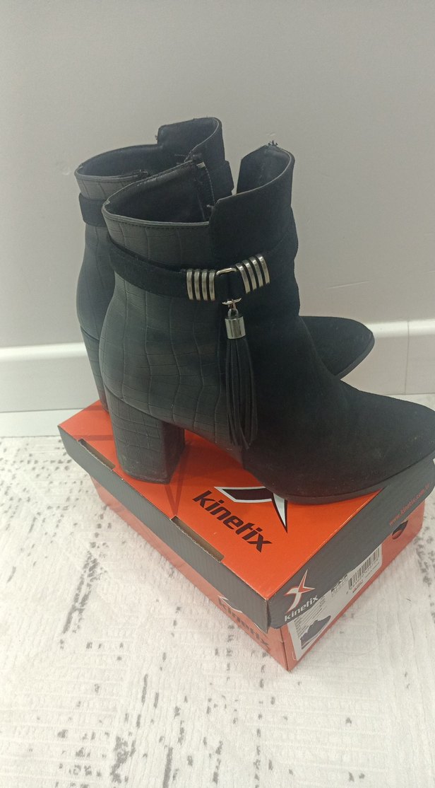Siyah süet malzemeden blok topuklu, tokalı kadın botu. Baskılı deseni ve Kinetix markası ile trend sokak stiline uygun.