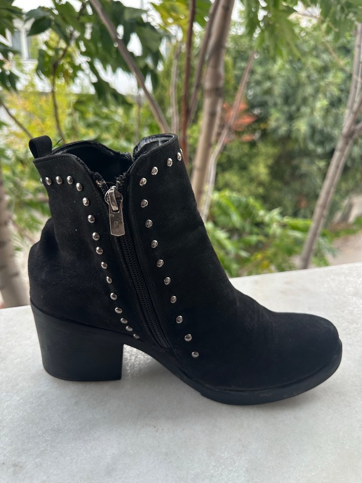 Siyah süet kadın botları, blok topuklu ve tokalı detaylara sahip. Yan fermuar ve perçin süslemeleri bulunur, trend rahat stil için uygundur. İki tarafı da fermuarlı