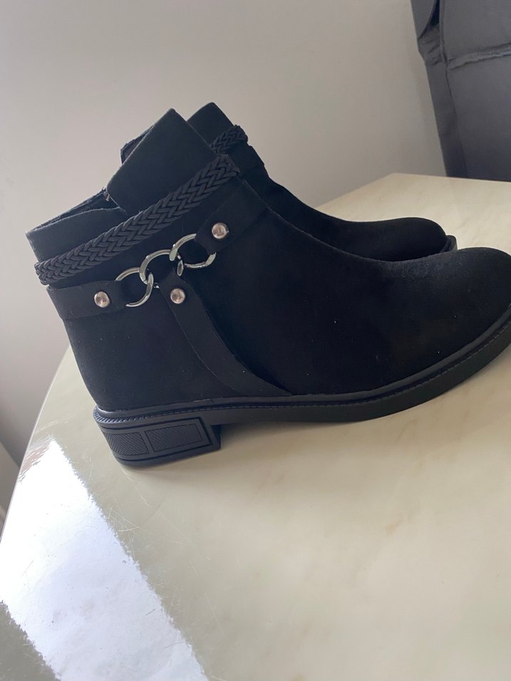 Siyah süet kadın botları, blok topuklu ve tokalı detaylı, gotik tarzda günlük kullanım için uygundur. Rahat ve trend.