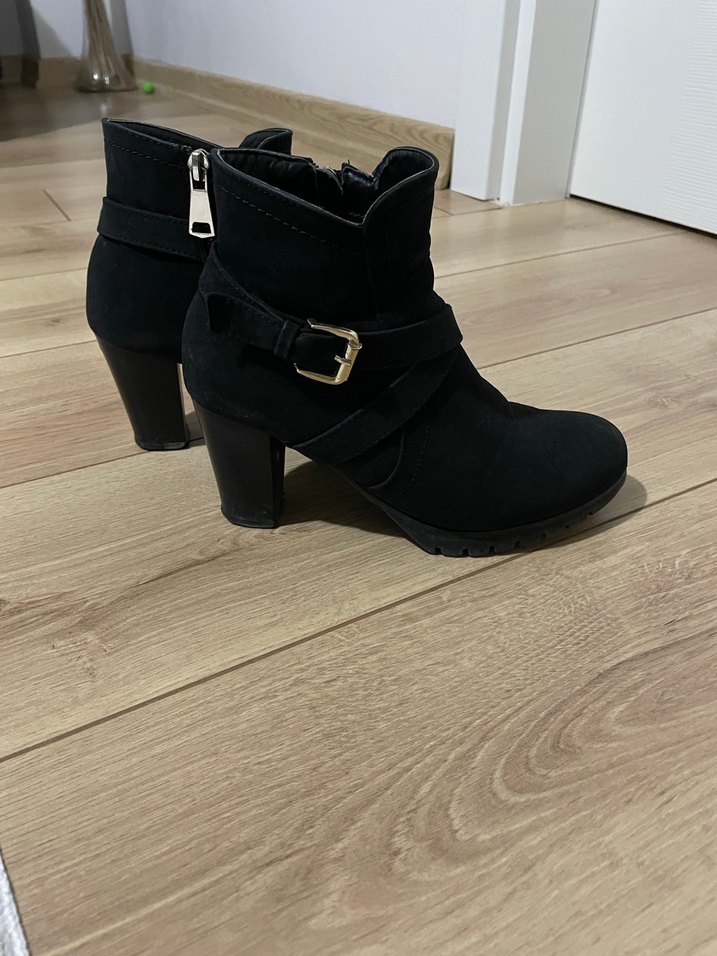 Siyah süet kadın botları, blok topuklu ve tokalı detaylara sahip. Minimalist goth tarzında, günlük kullanıma uygun. Sayılı giyildi hiç bir deformesi yoktur 37 numara topuk boyu 6,5 cm çok rahat giyimi vardır