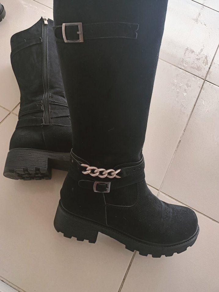 Siyah süet, tokalı ve zincir detaylı diz boyu goth tarzı çizme. Günlük rahat kullanıma uygun blok topuklu. 38 numara temiz sorunu yok az kullanılmış