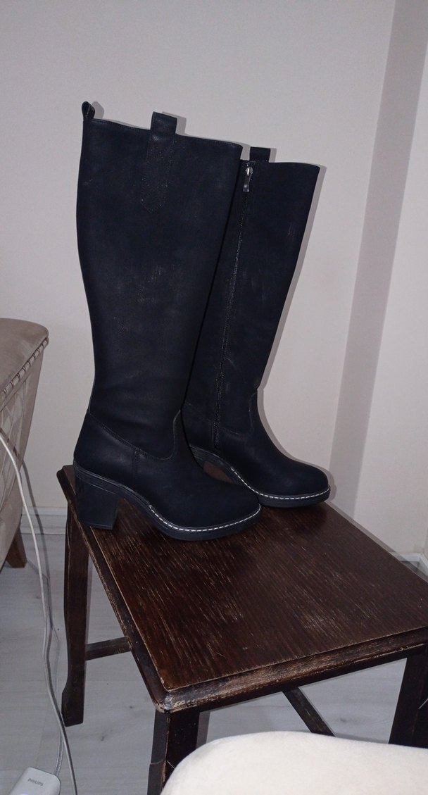 Siyah süet malzemeden yapılmış, blok topuklu ve tokalı dizüstü çizmelerdir. Gotik tarzı günlük kullanıma uygun şekilde yansıtır.