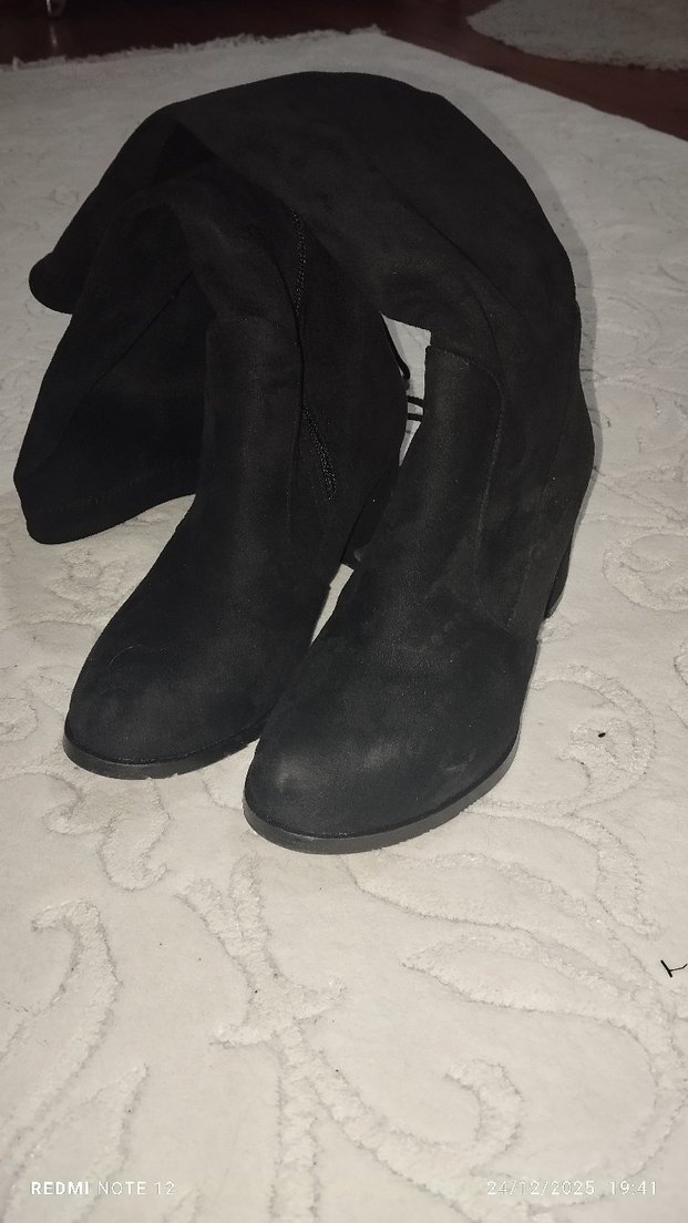 Siyah süet malzemeden yapılmış, tokalı ve kalın topuklu dizüstü bot. Trendy günlük kullanıma uygun gotik tarzda şık bir seçim.
