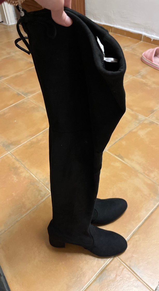 Siyah süet malzemeden yapılmış, tokalı ve stiletto topuklu dizüstü çizme. Gotik tarzda, günlük kullanıma uygun şık bir tasarım.