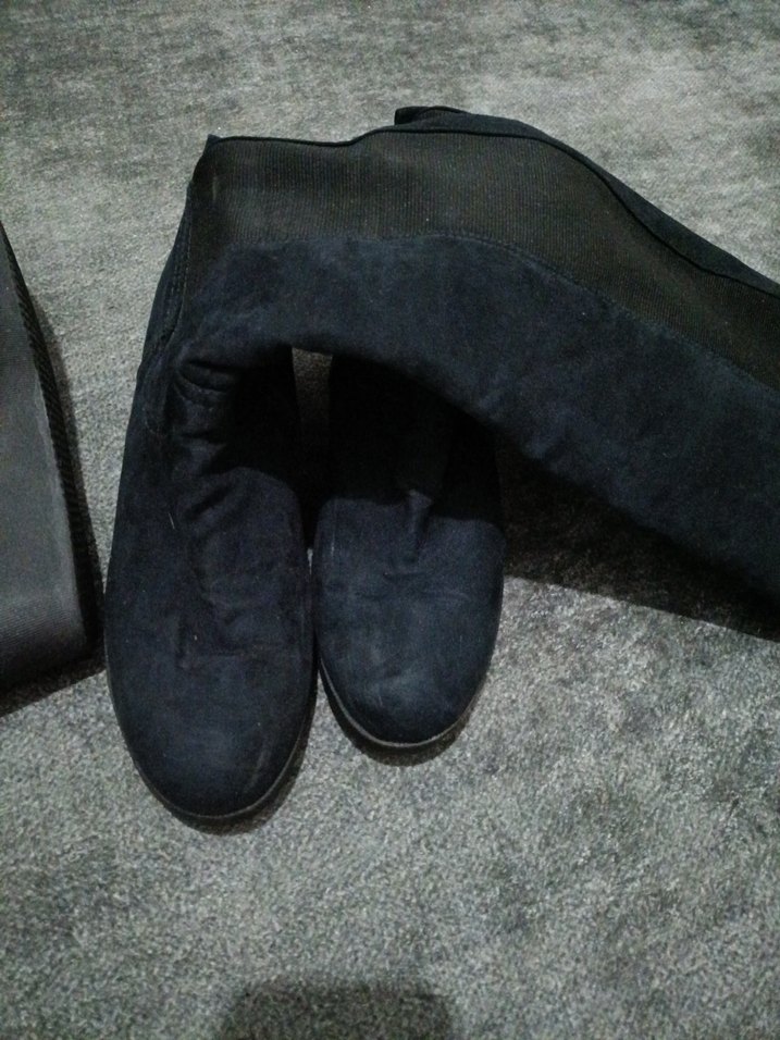Siyah süet dizüstü botlar, stiletto topuklu ve tokalı, rahat gotik tarzıyla günlük kullanım için uygundur.