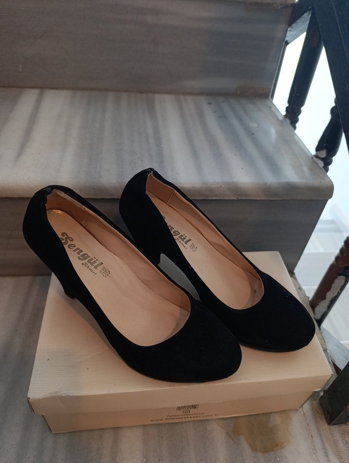 Siyah süet dolgu topuklu kadın stiletto, tokalı detaylı, minimalist ve gotik tarzda klasik ofis şıklığı sunar. Marka: Sengil.