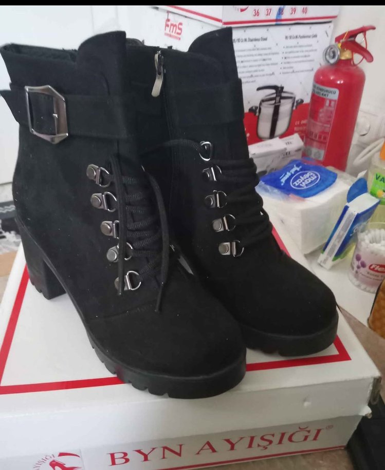 Siyah süet malzemeden blok topuklu, tokalı ve baskılı gotik tarz kadın botu. Trendy günlük kullanıma uygun.kaliteli normal parası 2000 tl