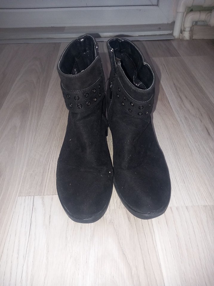 Siyah süet malzemeden yapılmış, tokalı ve perçin detaylı gotik tarzda dolgu topuklu botlar, günlük kullanıma uygun. ürün fotoğrafta göründüğü gibidir bir tarafındaki toka kopmuştur iade kabul etmiyorum çok uygun fiyata verebilecektir