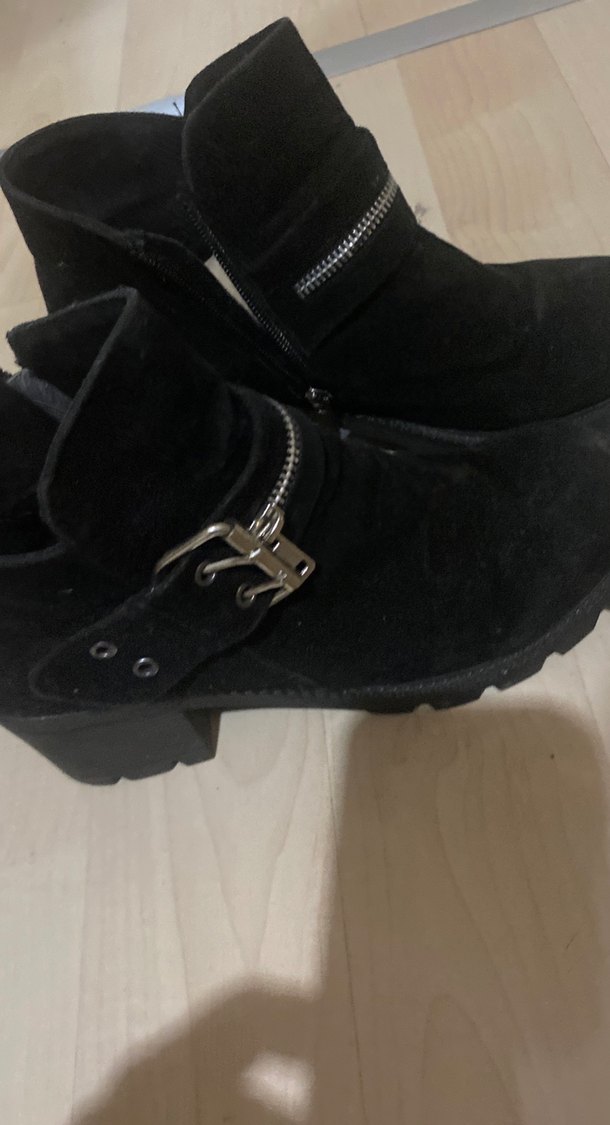 Siyah süet kadının botları, tokalı ve kalın topuklu, gotik tarzda günlük kullanıma uygun.