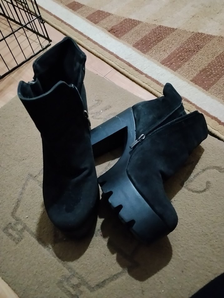 Siyah süet malzemeden, tokalı ve blok topuklu gotik tarzda kadın bot. Günlük kullanıma uygun, rahat ve şık bir modeldir.