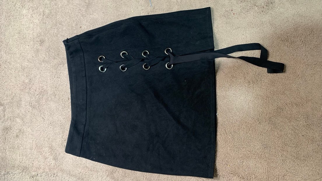 Siyah süet kumaştan, tokalı ve gözlük detaylı, vücuda oturan gotik tarzda mini etek, romantik akşamlar için uygundur.