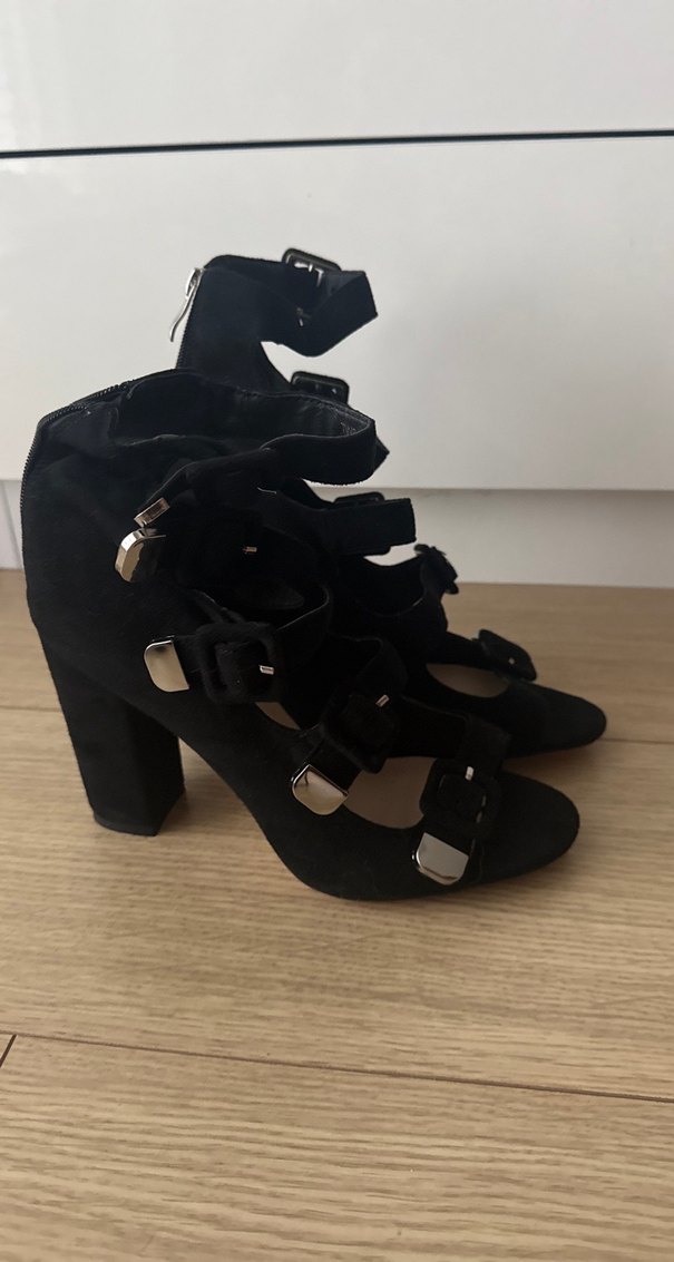 Siyah süet blok topuklu, çoklu tokalı ve desenli gotik tarzda, cesur romantik akşamlar için uygun ayakkabılar. Çok cool bir ayakkabı