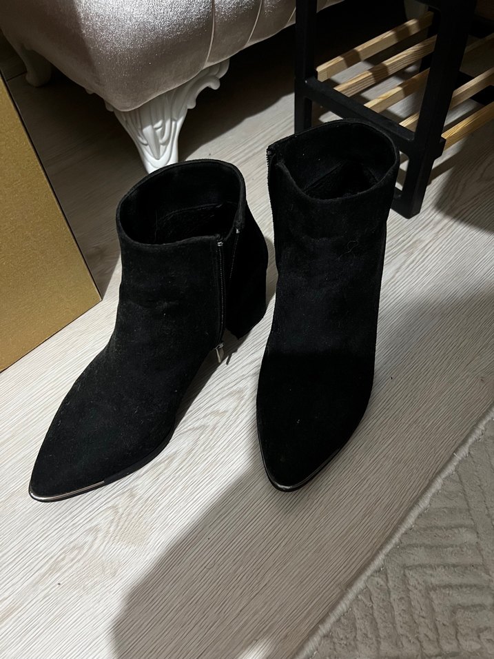 Siyah süet, ince topuklu ve tokalı botlar. Minimalist gotik tarzıyla trend günlük kullanıma uygundur.