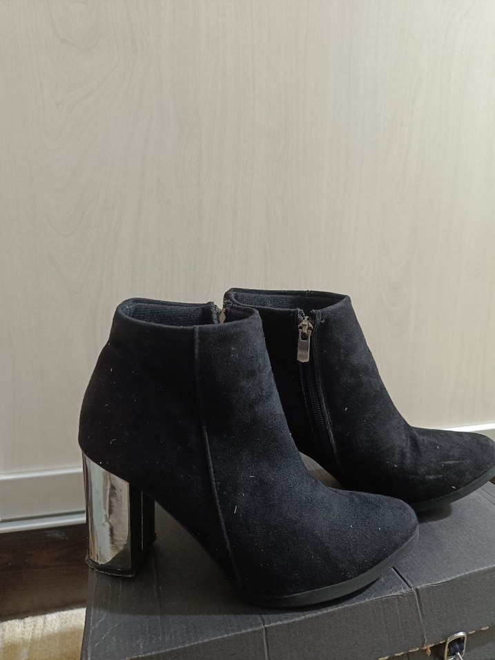 Siyah süet malzemeden, tokalı ve blok topuklu kadın botları, minimalist ve çağdaş tasarıma sahip, günlük kullanıma uygun.