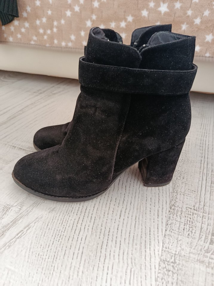 Siyah süet, tokalı ve blok topuklu kadın botları, günlük kullanıma uygun rahat ve şık bir modeldir.