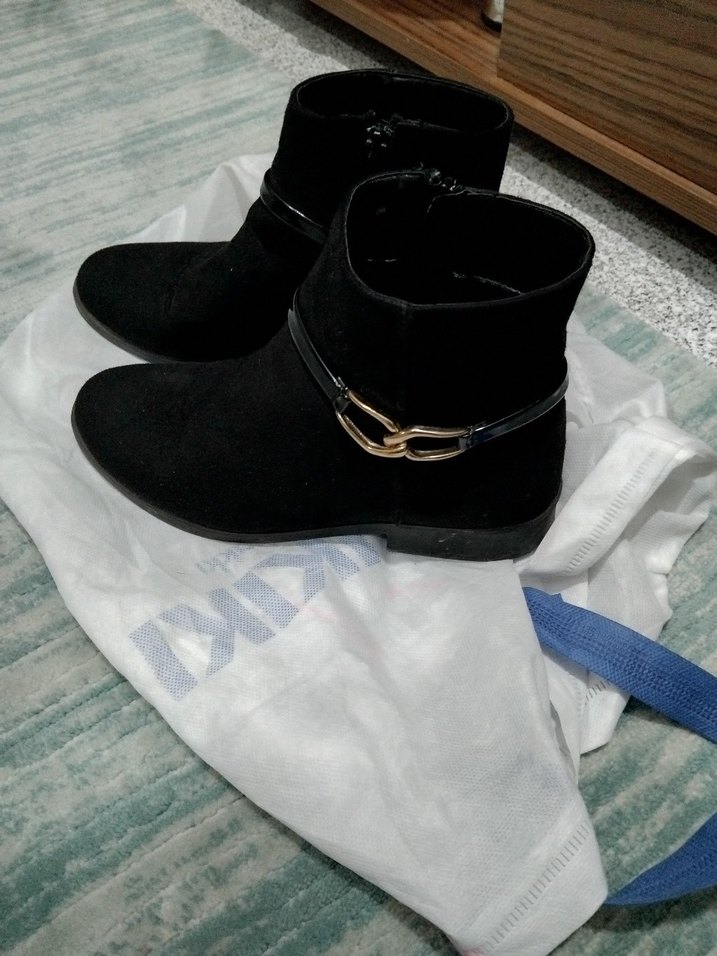 Siyah süet malzemeden yapılmış, tokalı ve kalın topuklu kadın botları. Günlük kullanım için uygun, trend sokak stiliyle uyumlu.Bi sorunu yoktur sağlam temiz kullanildi.37 numara