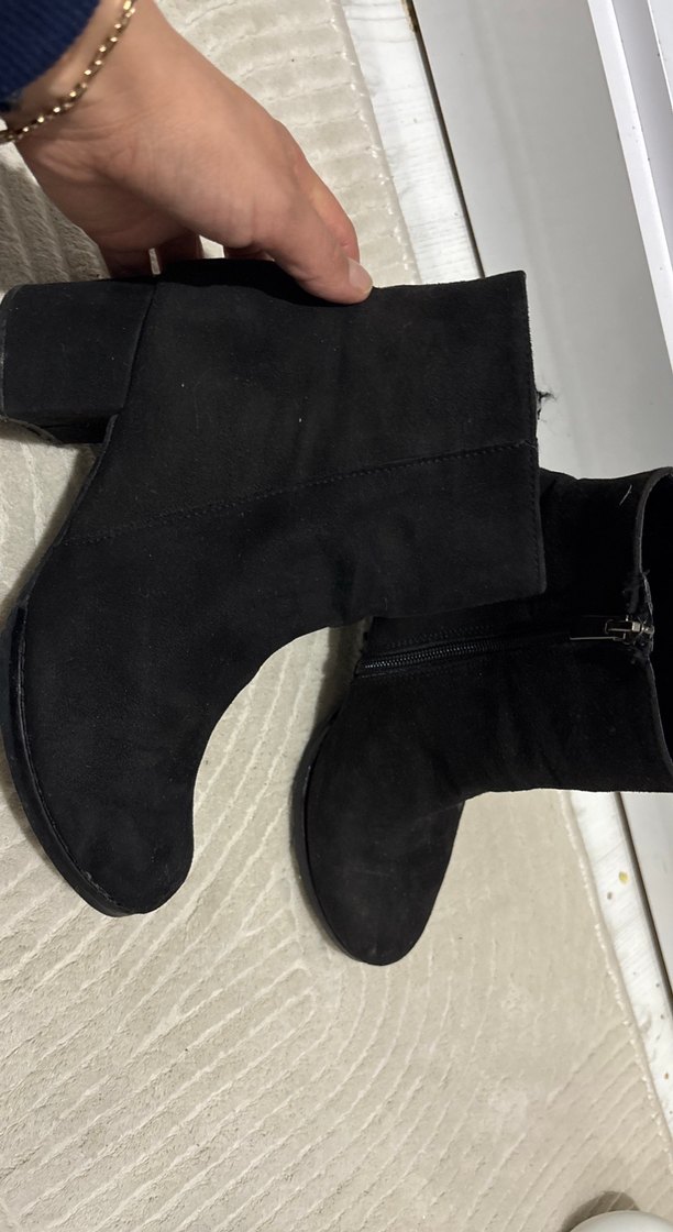 Blok topuklu, tokalı siyah süet kadın botu, rahat gotik tarzıyla günlük kullanıma uygundur.