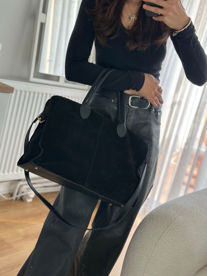 Siyah gerçek süet malzemeden yapılmış, tokalı ve modern tasarımlı kadın çantası. Günlük kullanıma uygun, trend bir görünüme sahiptir.