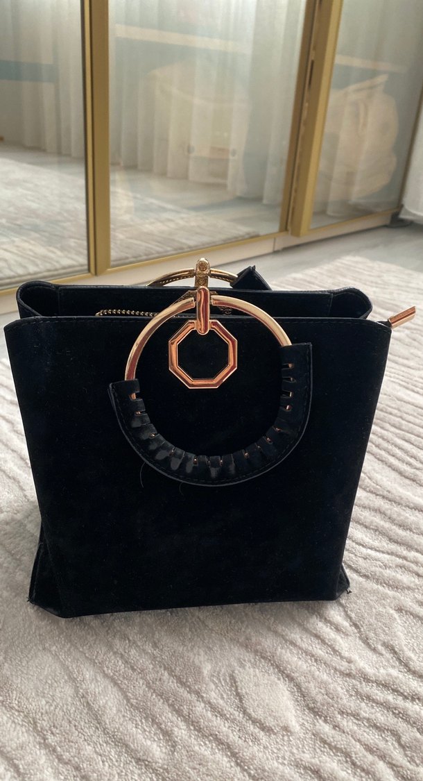 Siyah süet çanta, tokalı sap ve yılan desenli detaylarla klasik zarafeti çağdaş Paris tarzıyla buluşturuyor. Romantik akşamlar için uygun.