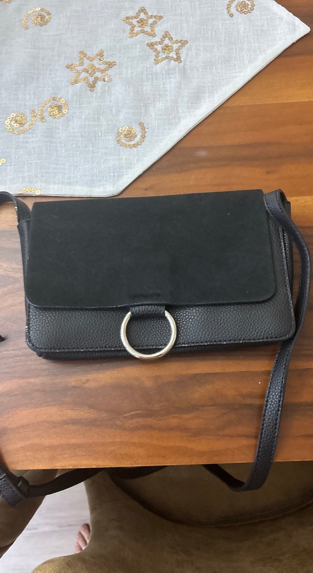 Siyah süet kapaklı, tokalı halka detayı ve dokulu gövdesiyle kadın çantası, trend sokak stili için uygun.