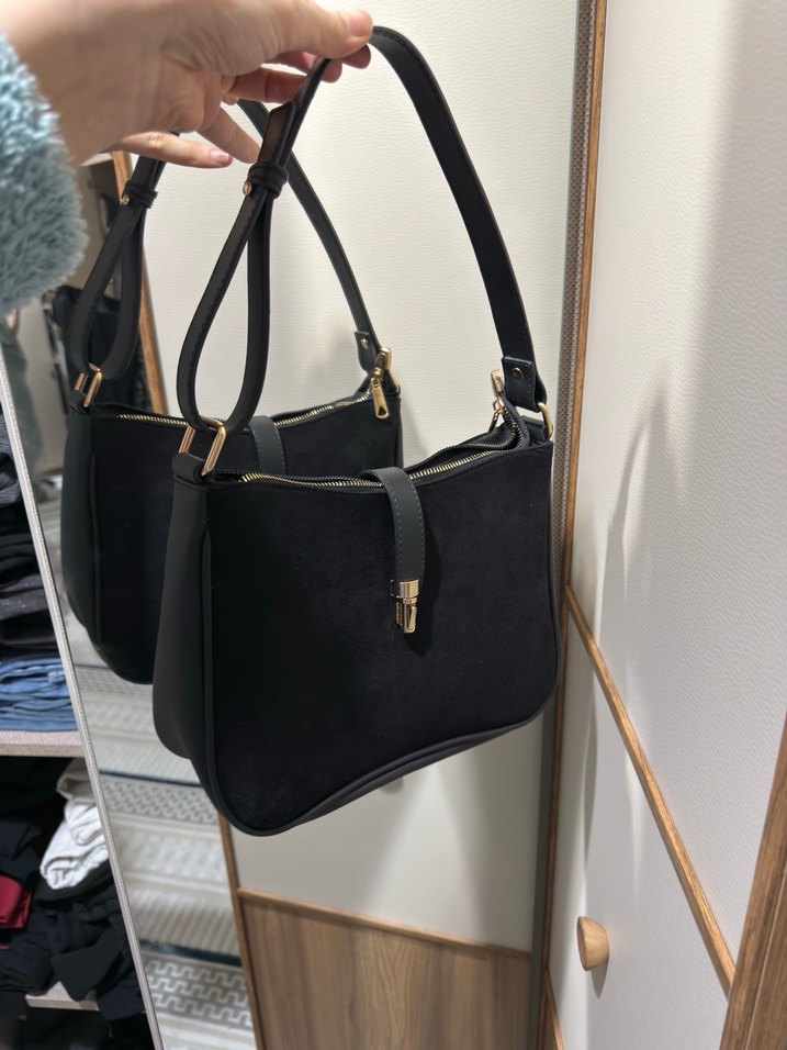 Siyah süet malzemeden yapılmış, tokalı askıya sahip bu kadın çantası, desen içermeyen sade tasarımıyla günlük kullanıma uygundur.